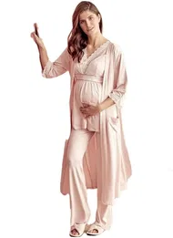% 342AnılSıfır Kol V Yaka Viskon Düz Yazlık Uzun Dantel Detaylı Hamile Pijama Takımı Sabahlık Anıl 5771
