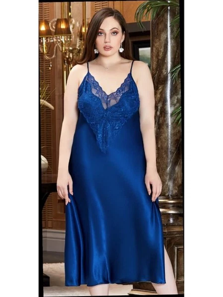 Büyük Beden 2'Li Uzun Saten Dantelli Gecelik Sabahlık Takım Jeremi 3250