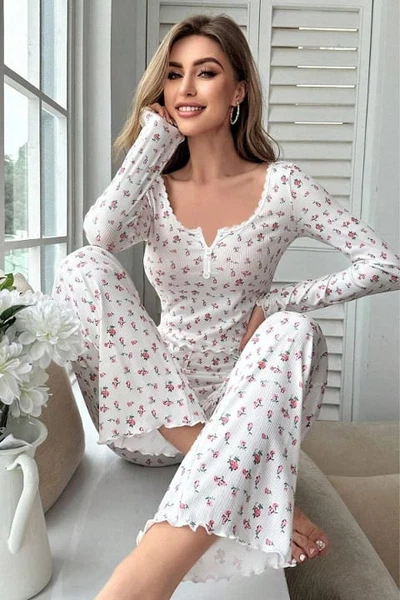Derin Yaka Ekru Uzun Kollu Kadın Pijama Takımı Bella Notte 7020
