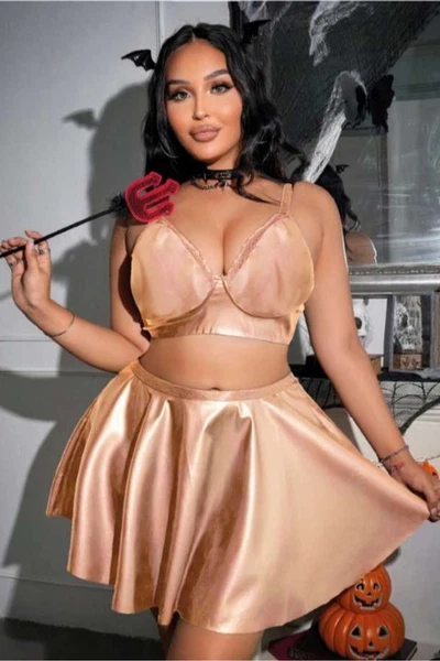 Gold metalik satenin ışık altındaki parlak yansımasıyla Real Passione 40023 parlak etekli takım, dikkat çekici bir fantezi set sunar. Şampanya altın tonundaki kumaş sıcak bir parlaklık oluştururken, iki parçalı yapı giyim kolaylığı sağlar.