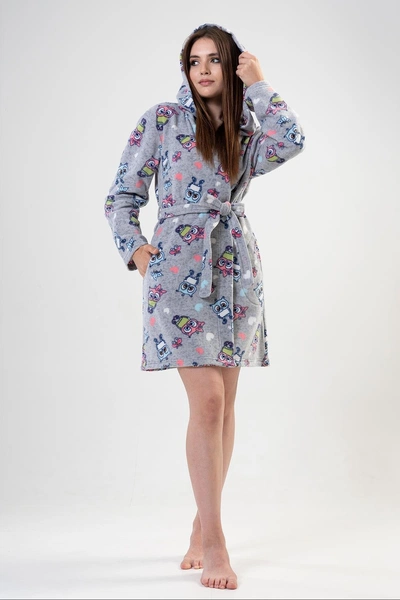 Kadın Polar Sabahlık Kapüşonlu Kısa Boy Gri Melanj Robot Desenli Vienetta K201008