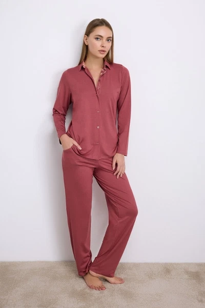 Kadın Uzun Kollu Düğmeli Gömlek ve Pantolon Pijama Takımı Anıl 11556