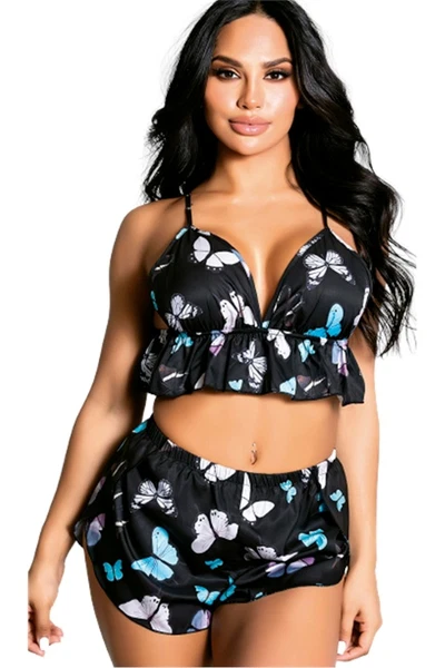 Night Light Kelebekli Siyah Saten Mini Şortlu Takım 3365
